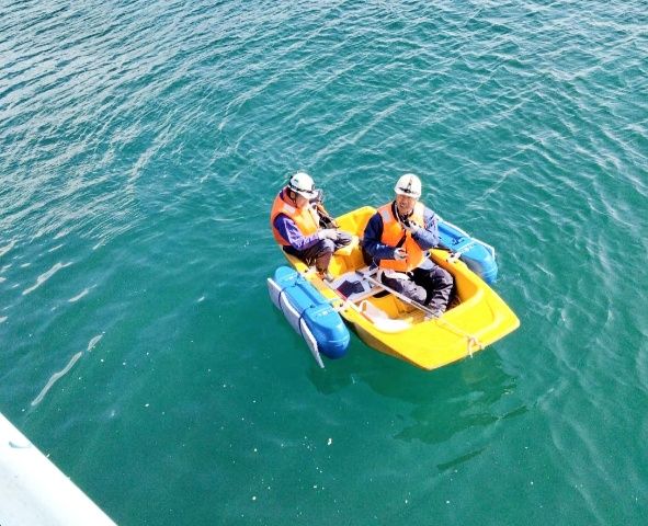 小型の船ではありますが、青色のサイドフロートのおかげで船体の安定性が高く、2人で乗船しても揺れが少なく、安心して作業を進めることができました。